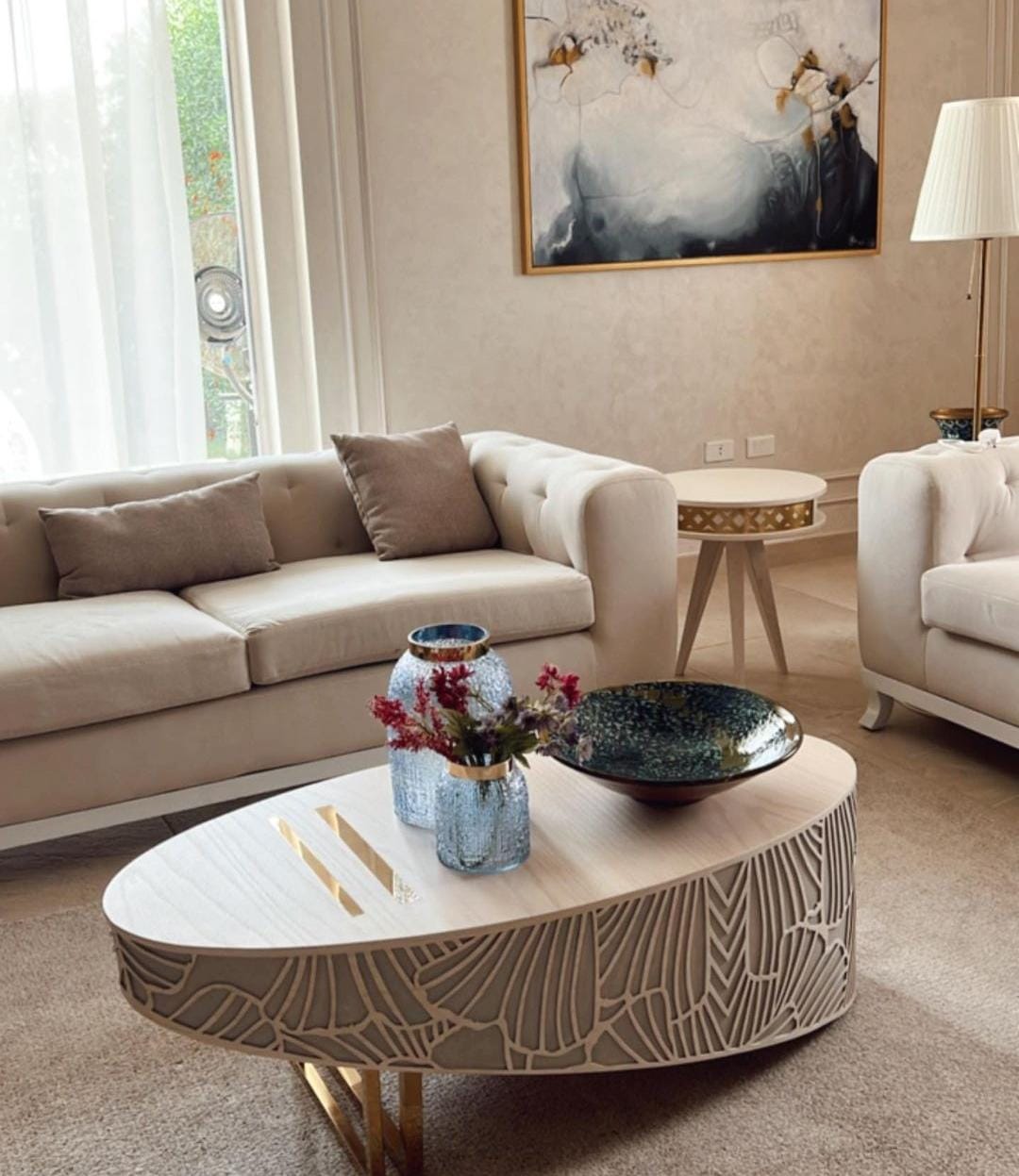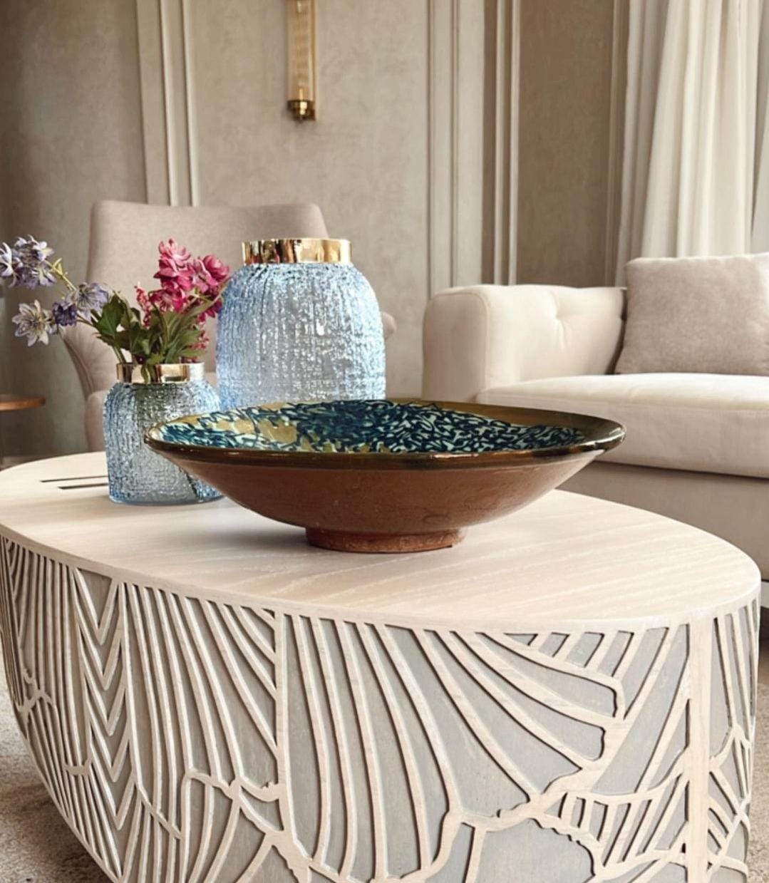 A unique natural wood table with hand-painted designs, blending elegance and craftsmanship to add a distinctive touch to any space.