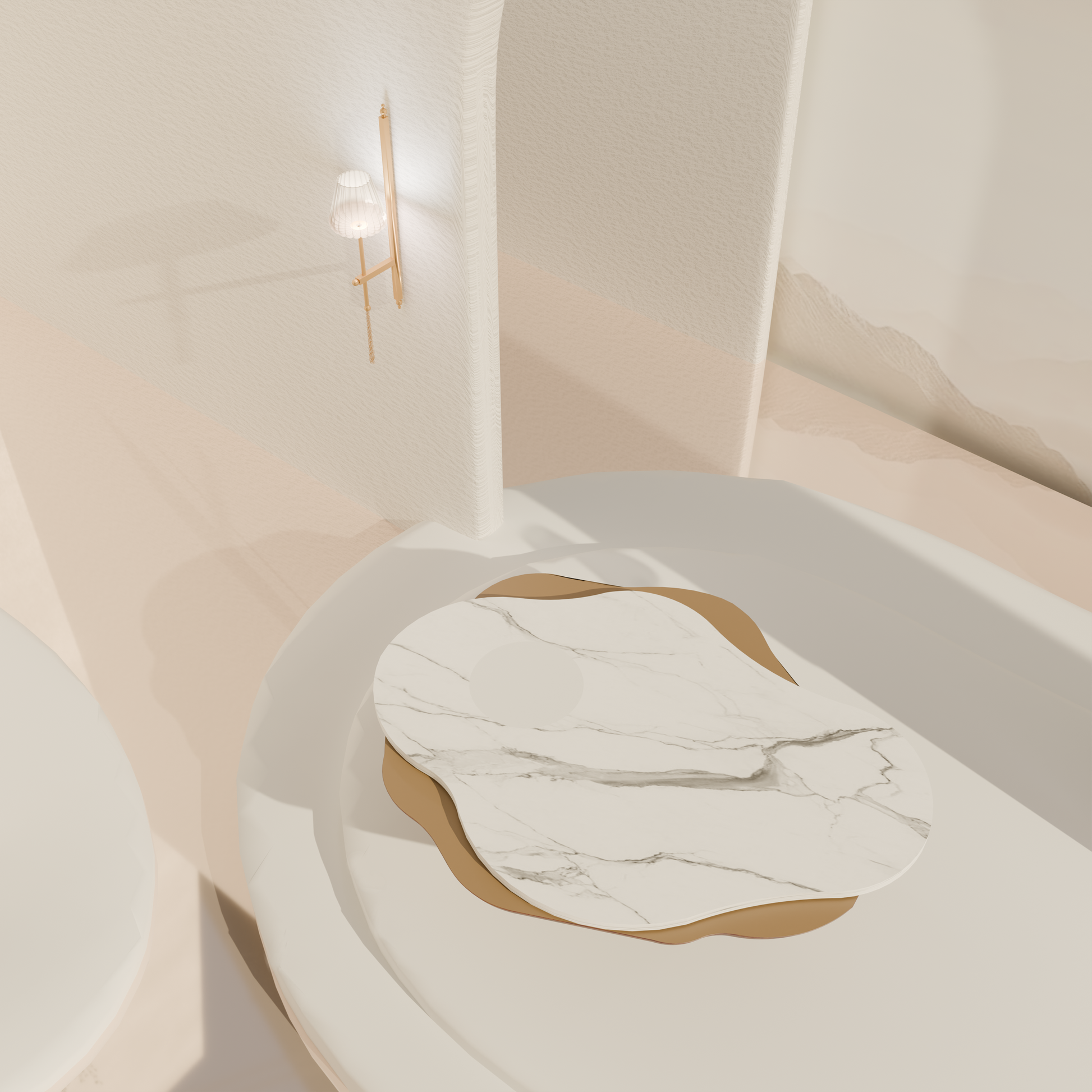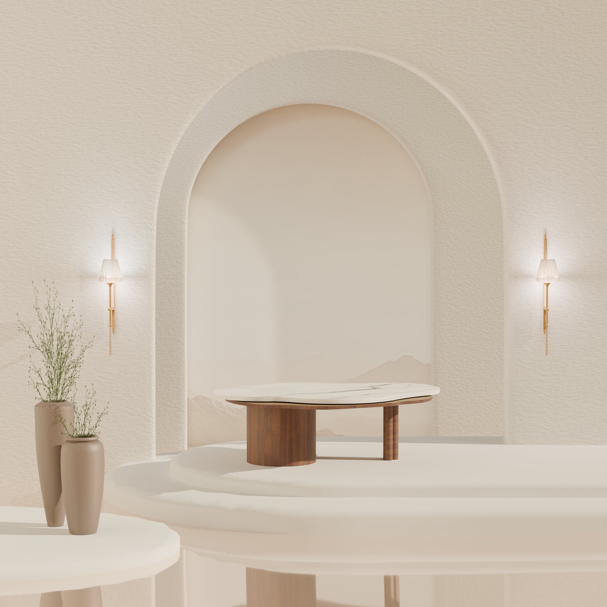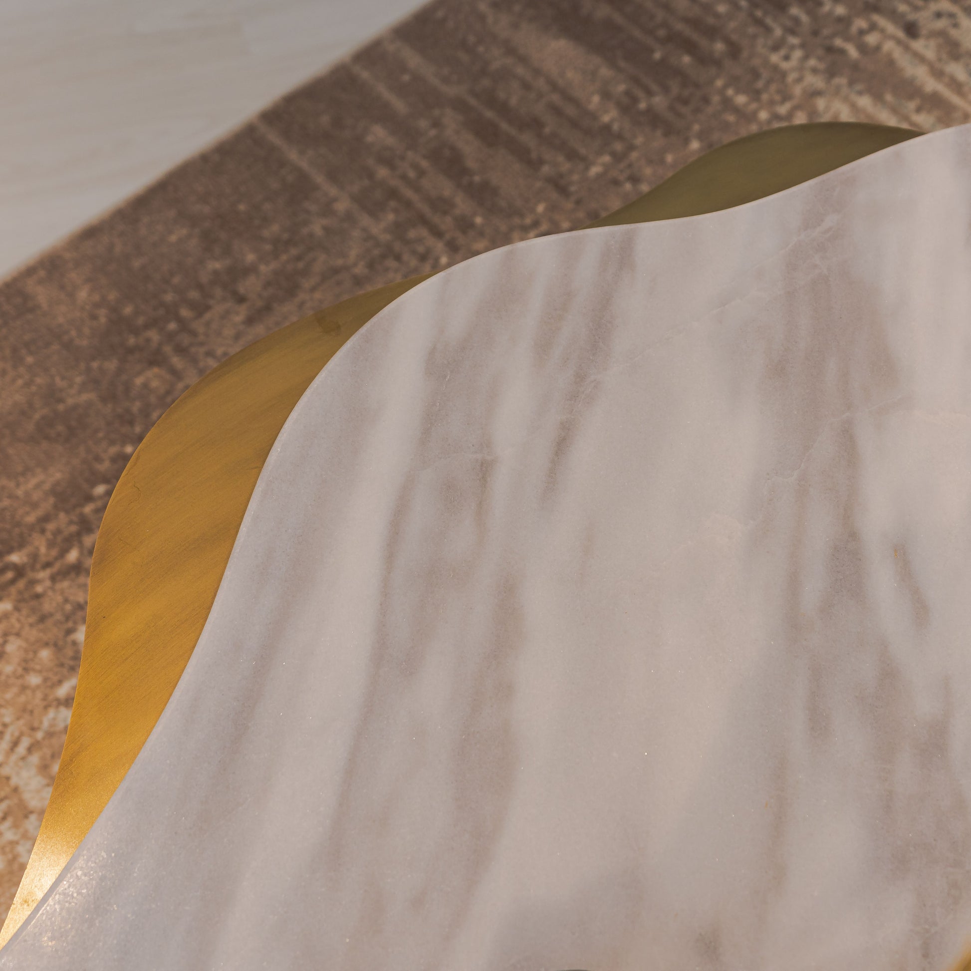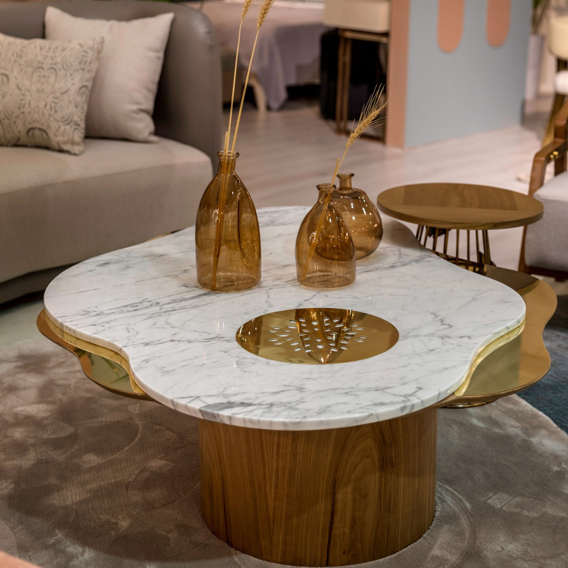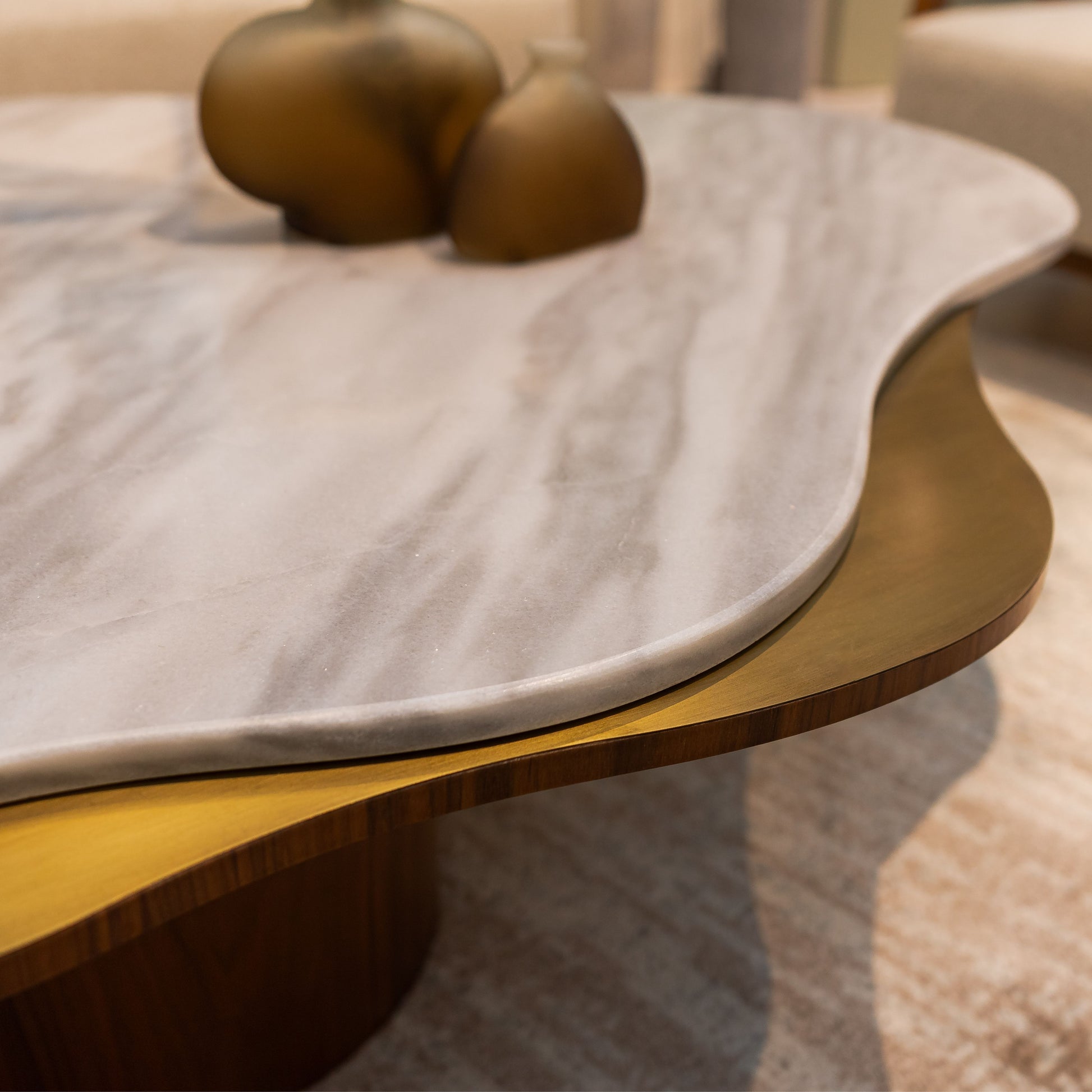 The Kimmie Coffee Table combines natural wood, marble, and brass to create a stunning piece with intricate hand-painted designs. This elegant table blends sophistication and artisanal craftsmanship, making it a standout addition to any living space.