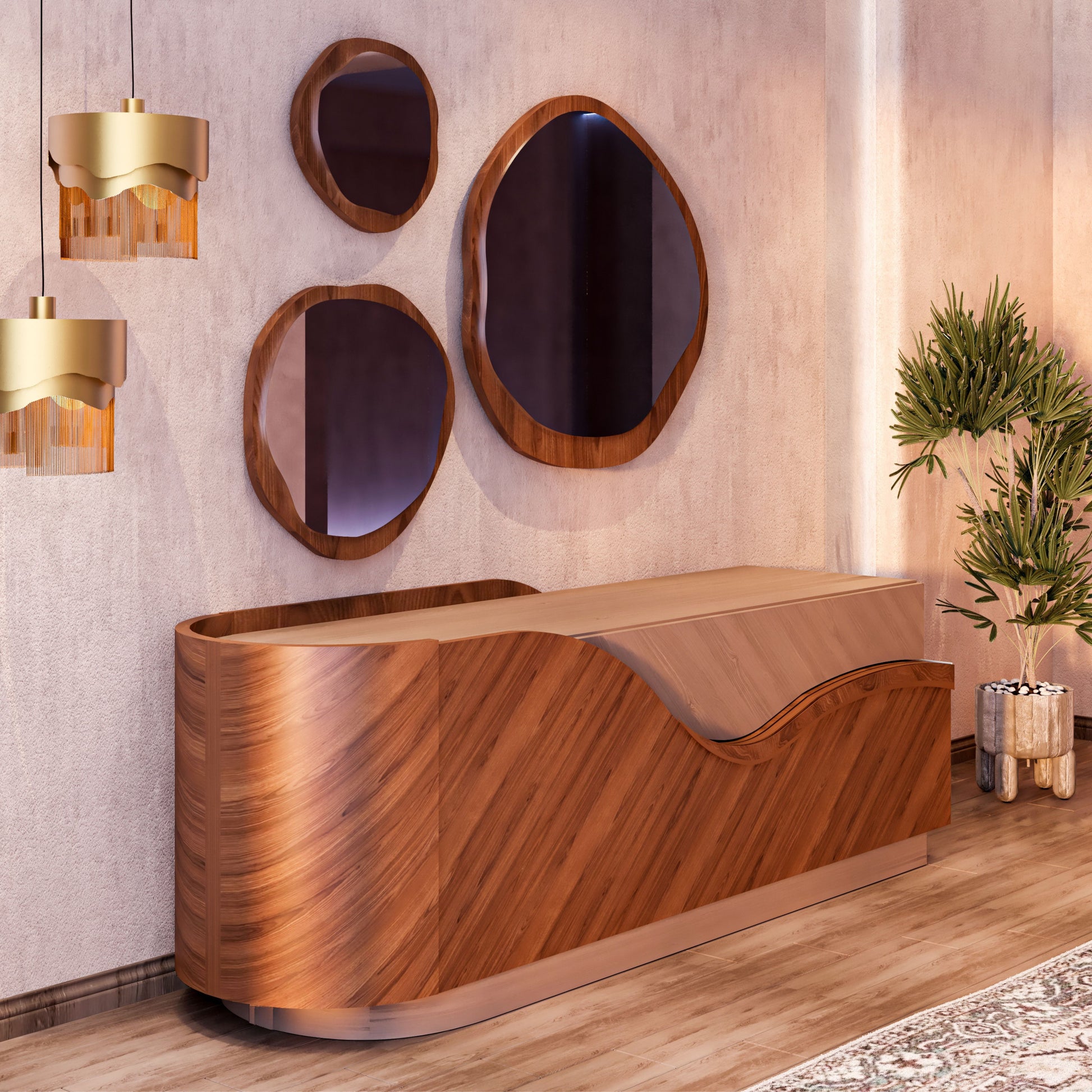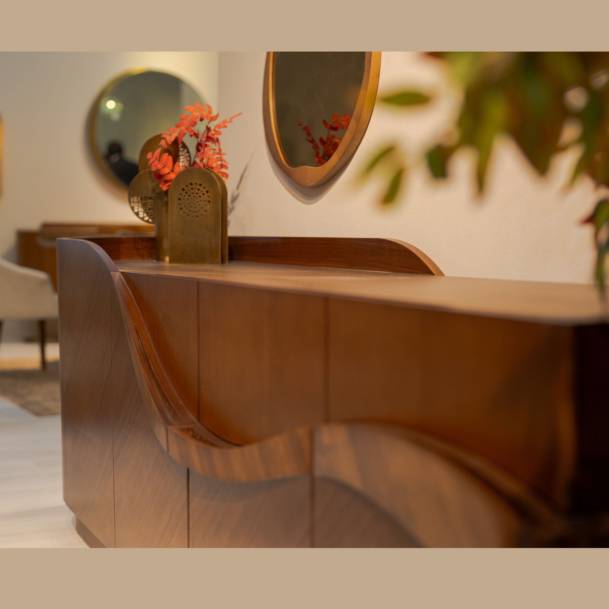 “This buffet, inspired by the feather motif from an ancient Egyptian royal crown, combines historical elegance with modern craftsmanship. Made from natural wood, it showcases exquisite design and timeless sophistication.”
